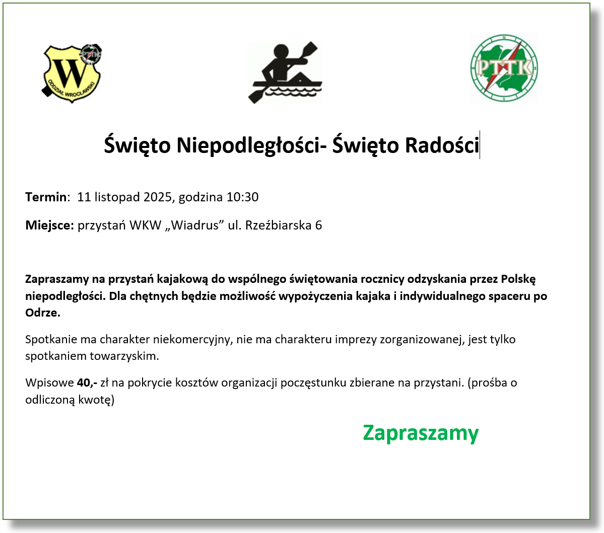 | 1. | 2025-11-11 | Spotkanie: "Święto Niepodległości- Święto Radości" (planowane świąteczne pływanie rzeką Odrą) |